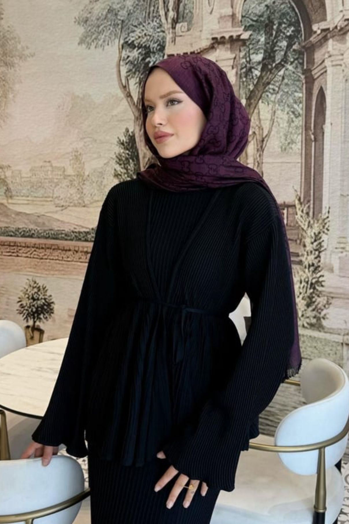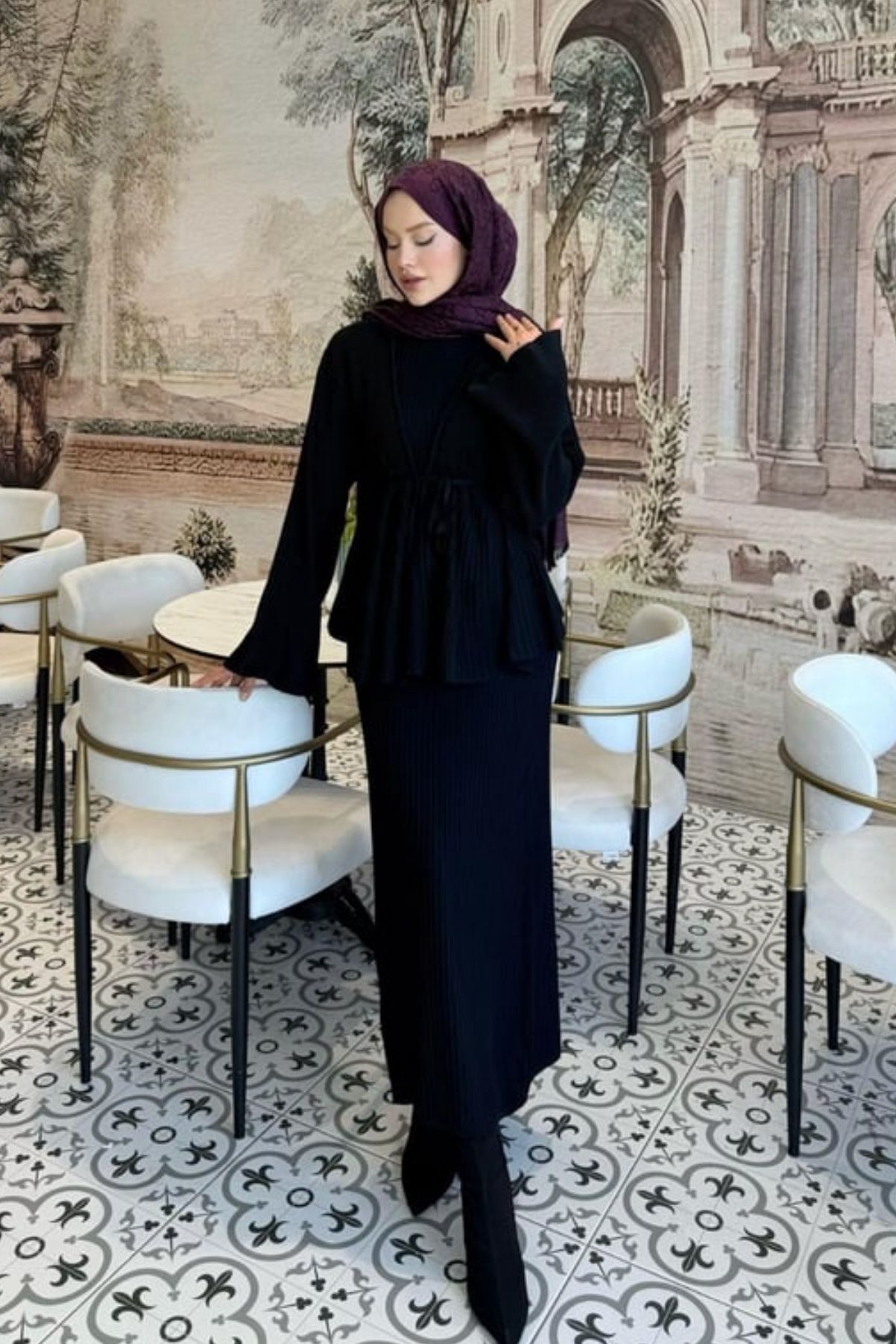 طقم تريكو ٣ قطع  فستان و جاكيت و حزام طول الفستان ١٤٠ سم طول الجاكيت ٦٥ سم الفستان ون سايز