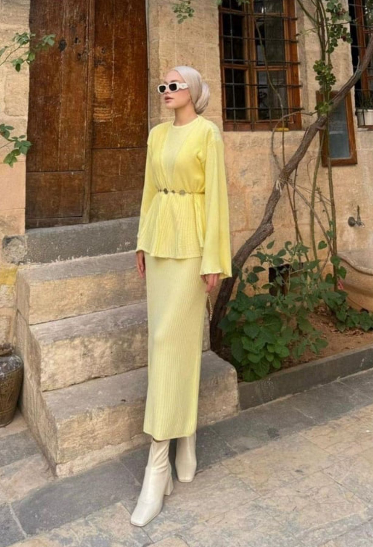 طقم تريكو ٣ قطع  فستان و جاكيت و حزام طول الفستان ١٤٠ سم طول الجاكيت ٦٥ سم الفستان ون سايز