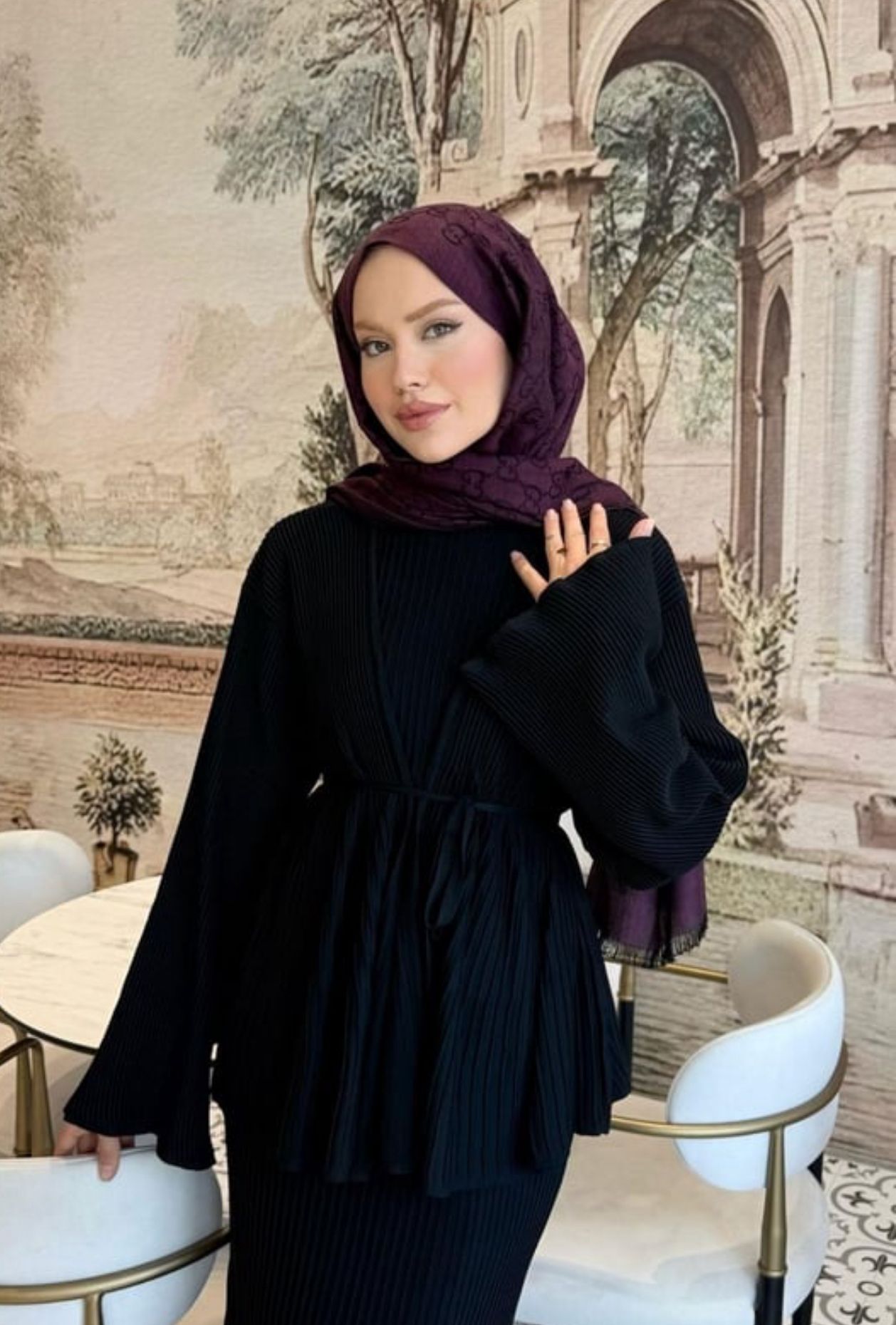 طقم تريكو ٣ قطع  فستان و جاكيت و حزام طول الفستان ١٤٠ سم طول الجاكيت ٦٥ سم الفستان ون سايز