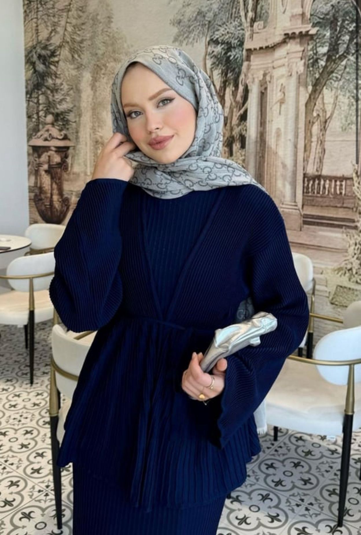 طقم تريكو ٣ قطع  فستان و جاكيت و حزام طول الفستان ١٤٠ سم طول الجاكيت ٦٥ سم الفستان ون سايز