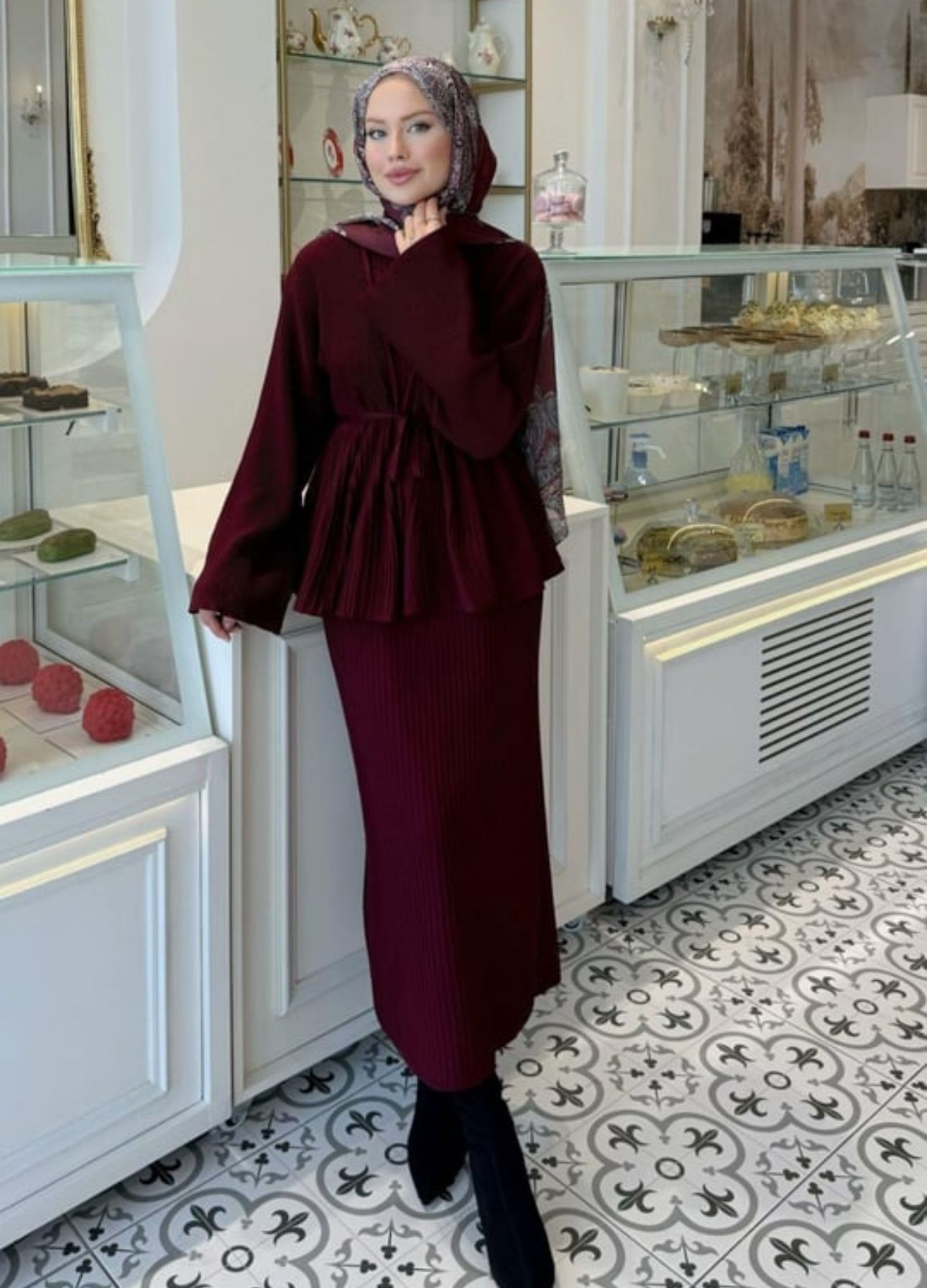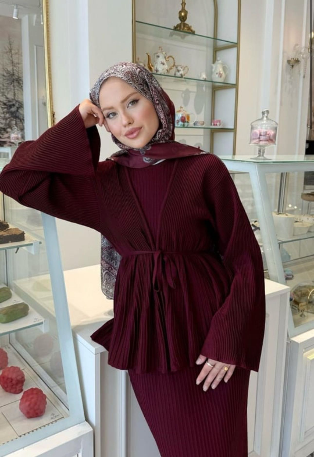 طقم تريكو ٣ قطع  فستان و جاكيت و حزام طول الفستان ١٤٠ سم طول الجاكيت ٦٥ سم الفستان ون سايز